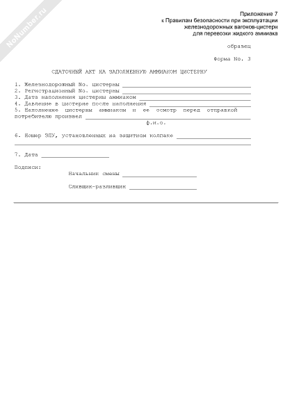 Сдаточный акт на заполненную аммиаком цистерну (форма № 3)