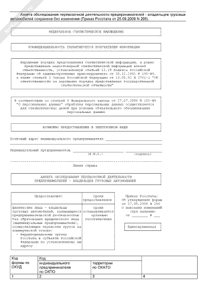 - 107Анкета обследования перевозочной деятельности предпринимателей — владельцев грузовых автомобилей (единовременная)