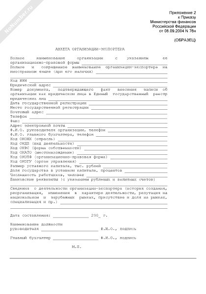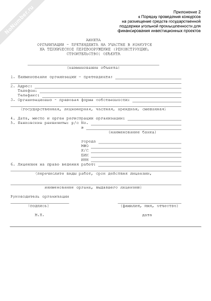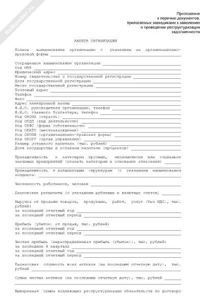 - 114Анкета организации к перечню документов, прилагаемых заемщиками к заявлению о проведении реструктуризации задолженности по государственным кредитам, полученным субъектами Российской Федерации и российскими организациями в результате отпуска драгоценных металлов из государственного фонда драгоценных металлов и драгоценных камней Российской Федерации