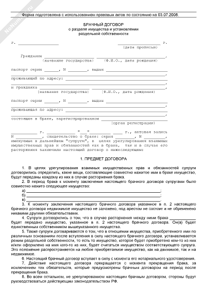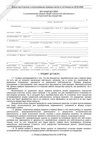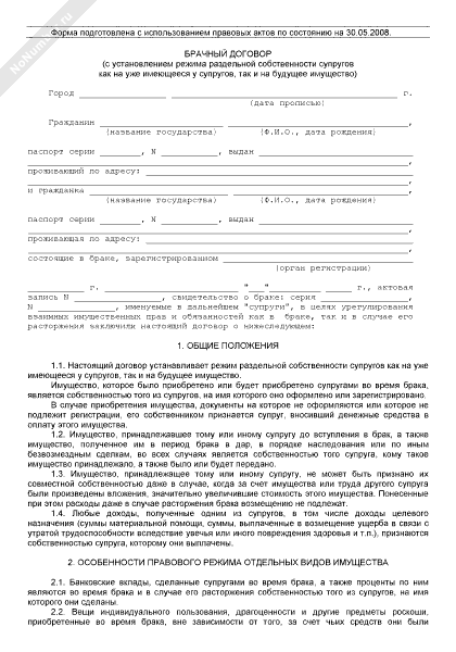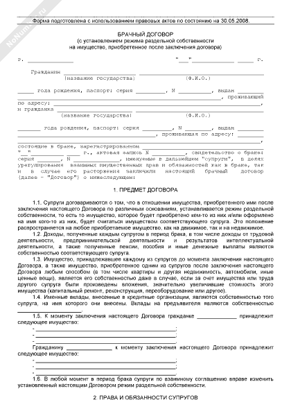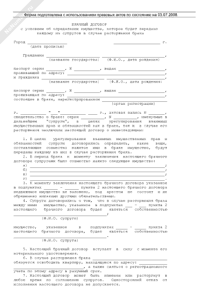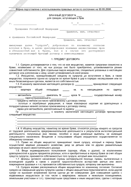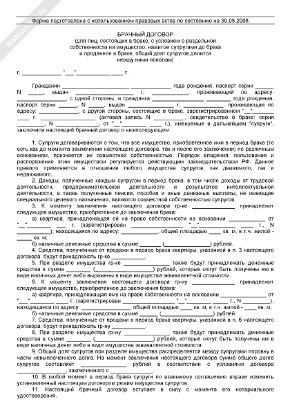 Форма брачного договора определена законом. Брачный договор должен быть заключен в письменной форме и нотариально удостоверен. Супруги (будущие супруги) должны собственноручно подписать брачный договор и лично присутствовать при его удостоверении у нотариуса. Удостоверение брачного договора через представителя (доверенное лицо) не допускается.