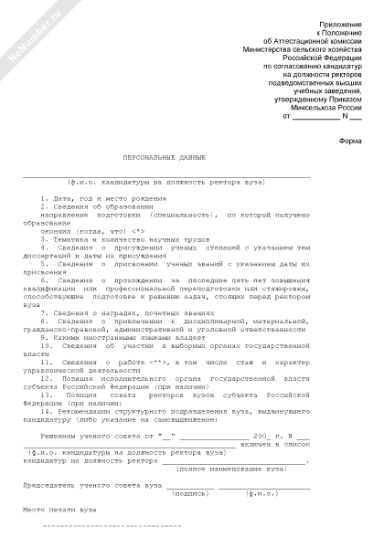 - 205Персональные данные кандидатуры на должность ректора высшего учебного заведения, подведомственного Минсельхозу России
