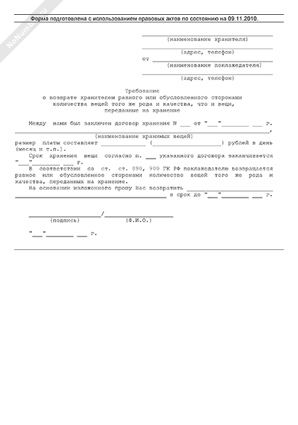 Требование поклажедателя о возврате хранителем равного или обусловленного сторонами количества вещей того же рода и качества, что и вещи, переданные на хранение