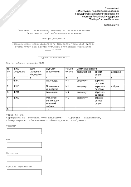 - 31Данные для размещения на сайтах избирательных комиссий субъектов Российской Федерации. Сведения о кандидатах в депутаты законодательного (представительного) органа государственной власти субъекта Российской Федерации, выдвинутых по одномандатным (многомандатным) избирательным округам (таблица 2.10)