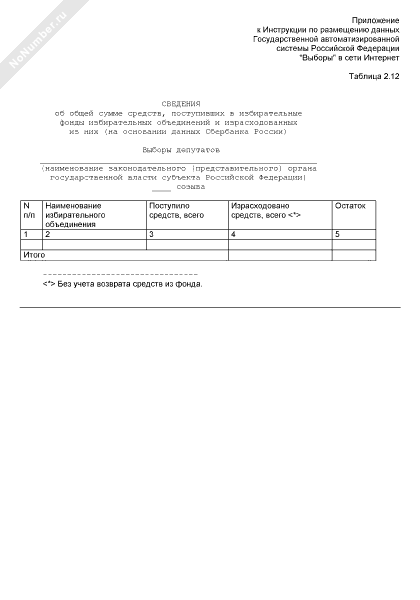 - 33Данные для размещения на сайтах избирательных комиссий субъектов Российской Федерации. Сведения об общей сумме средств, поступивших в избирательные фонды избирательных объединений (на выборах депутатов законодательного (представительного) органа государственной власти субъекта Российской Федерации) и израсходованных из них (на основании данных Сбербанка России) (таблица 2.12)