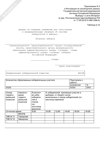 - 35Данные для размещения на сайтах избирательных комиссий субъектов Российской Федерации. Данные об открытии помещений для голосования и предварительные сведения об участии избирателей в голосовании на выборах депутатов законодательного (представительного) органа государственной власти субъекта Российской Федерации (таблица 2.14)