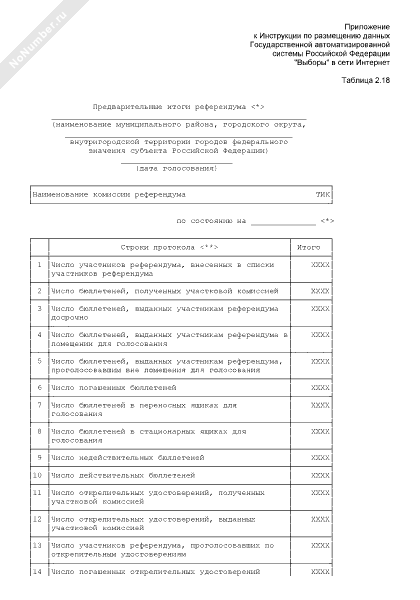 - 39Данные для размещения на сайтах избирательных комиссий субъектов Российской Федерации. Предварительные итоги референдума муниципального района, городского округа, внутригородской территории городов федерального значения субъекта Российской Федерации (таблица 2.18)