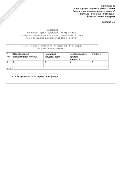 - 24Данные для размещения на сайтах избирательных комиссий субъектов Российской Федерации. Сведения об общей сумме средств, поступивших в фонды референдума субъекта Российской Федерации и израсходованных из них (на основании данных Сбербанка России) (таблица 2.3)