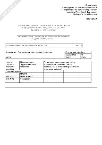 - 25Данные для размещения на сайтах избирательных комиссий субъектов Российской Федерации. Данные об открытии помещений для голосования и предварительные сведения об участии граждан в референдуме субъекта Российской Федерации (таблица 2.4)