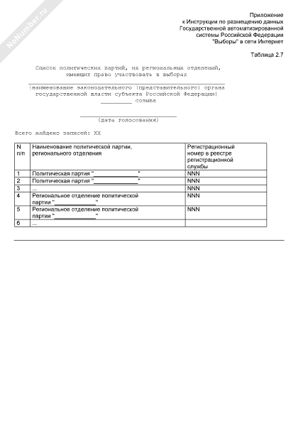 - 28Данные для размещения на сайтах избирательных комиссий субъектов Российской Федерации. Список политических партий, их региональных отделений, имеющих право участвовать в выборах в депутаты законодательного (представительного) органа государственной власти субъекта Российской Федерации (таблица 2.7)