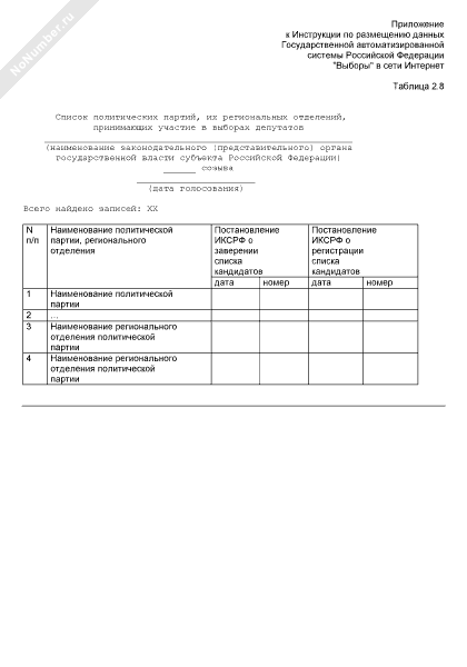 - 29Данные для размещения на сайтах избирательных комиссий субъектов Российской Федерации. Список политических партий, их региональных отделений, принимающих участие в выборах депутатов законодательного (представительного) органа государственной власти субъекта Российской Федерации (таблица 2.8)
