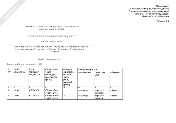 - 30Данные для размещения на сайтах избирательных комиссий субъектов Российской Федерации. Сведения о списке кандидатов, выдвинутом политической партией на выборы депутатов законодательного (представительного) органа государственной власти субъекта Российской Федерации (таблица 2.9)