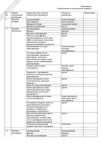 Данные о техническом состоянии каждого игрового автомата и игровых программах (приложение к заключению по результатам проверки технического состояния игрового оборудования, установленного в игорном заведении)