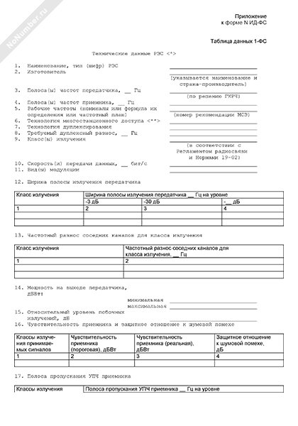 Технические данные РЭС (Таблица данных 1-ФС) (приложение к форме N ИД-ФС)