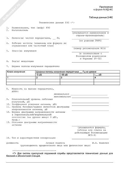 Технические данные РЭС (Таблица данных 2-ФС) (приложение к форме N ИД-ФС)