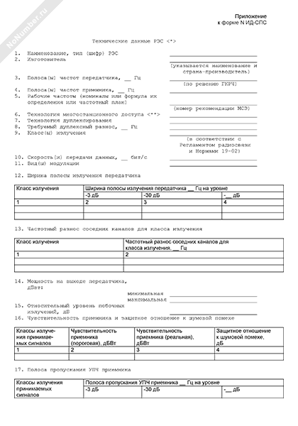 Технические данные РЭС (приложение к форме N ИД-СПС)