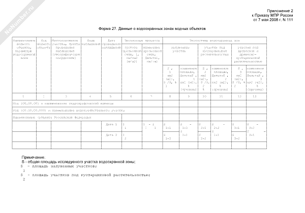 Формы представления в Федеральное агентство водных ресурсов данных мониторинга, полученных участниками ведения государственного мониторинга водных объектов. Данные о водоохранных зонах водных объектов (форма № 27)