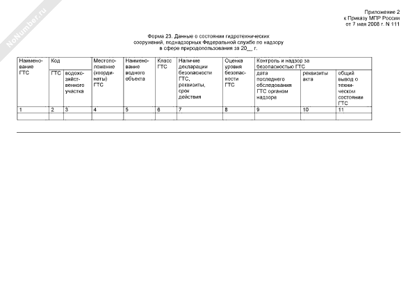 Формы представления в Федеральное агентство водных ресурсов данных мониторинга, полученных участниками ведения государственного мониторинга водных объектов. Данные о состоянии гидротехнических сооружений, поднадзорных Федеральной службе по надзору в сфере природопользования (форма № 23)