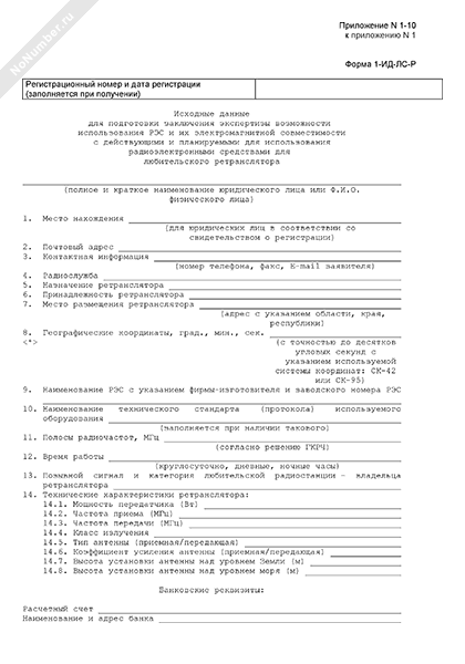 Исходные данные для подготовки заключения экспертизы возможности использования РЭС и их электромагнитной совместимости с действующими и планируемыми для использования радиоэлектронными средствами для любительского ретранслятора. Форма № 1-ИД-ЛС-Р (рекомендуемый образец заполнения)