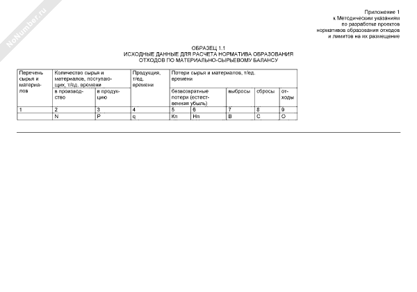 Исходные данные для расчета норматива образования отходов по материально-сырьевому балансу (рекомендуемый образец заполнения)
