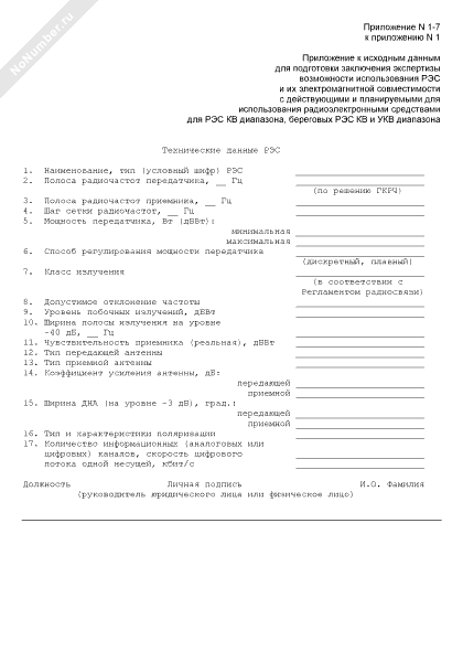 Технические данные РЭС (приложение к исходным данным для подготовки заключения экспертизы возможности использования РЭС и их электромагнитной совместимости с действующими и планируемыми для использования радиоэлектронными средствами для РЭС КВ диапазона, береговых РЭС КВ и УКВ диапазона. Форма № 1-ИД-ФС)