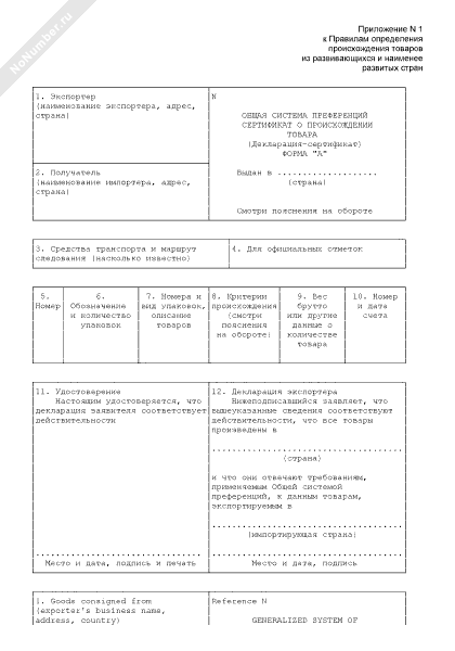 Декларация-сертификат о происхождении товара (рус./англ.). Форма № «А»