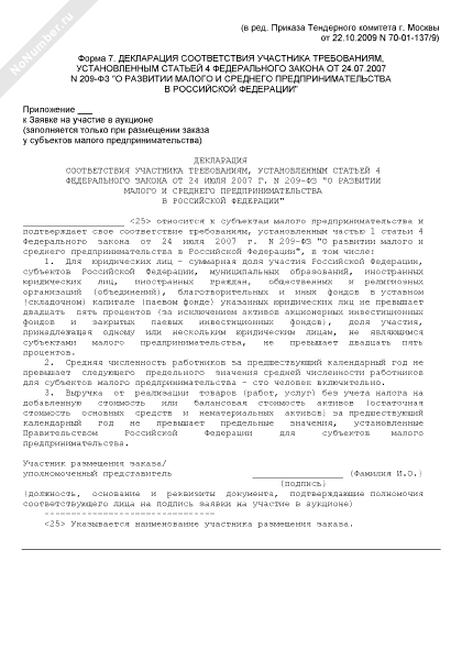 Декларация соответствия участника требованиям, установленным статьей 4 Федерального закона от 24.07.2007 № 209-ФЗ «О развитии малого и среднего предпринимательства в Российской Федерации» (приложение к заявке на участие в аукционе на право заключения государственного контракта на поставки товаров, выполнение работ, оказание услуг для государственных нужд города Москвы) (форма № 7)