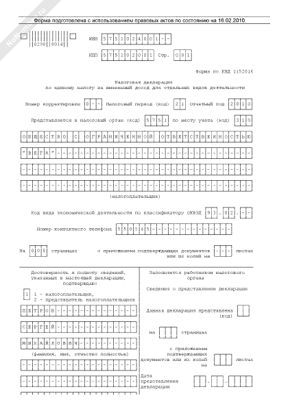 Налоговая декларация по единому налогу на вмененный доход (рекомендуемый образец заполнения)