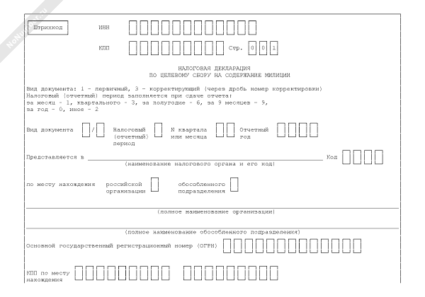 Налоговая декларация по целевому сбору на содержание милиции в городе Подольске Московской области (рекомендуемый образец заполнения)