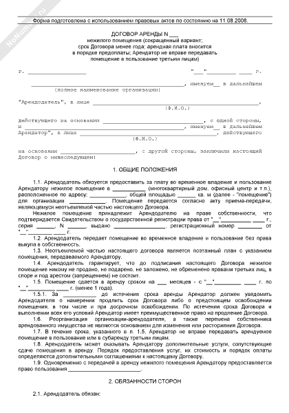 - 200Договор аренды нежилого помещения на срок менее 1 года (целевое использование помещения, без права субаренды, уплата пени с момента выставления претензии) (для целей налогообложения)