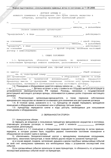 - 181Договор аренды нежилого помещения и оборудования (без права сдавать имущество в субаренду, арендатор производит капитальный ремонт)