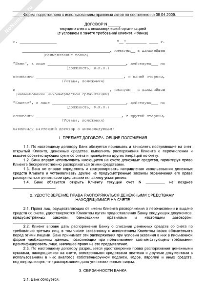 - 2043Договор текущего счета с некоммерческой организацией (с условием о зачете требований клиента и банка)