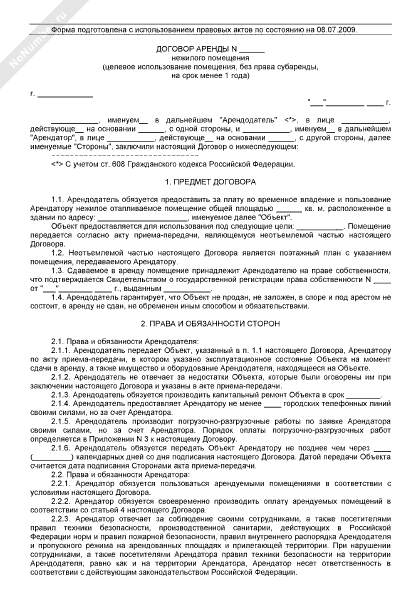 - 206Договор аренды нежилого помещения (целевое использование помещения, без права субаренды, на срок менее 1 года)