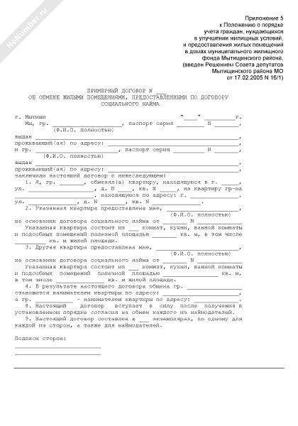 - 2306Примерный договор об обмене жилыми помещениями, предоставленными по договору социального найма на территории Мытищинского района Московской области