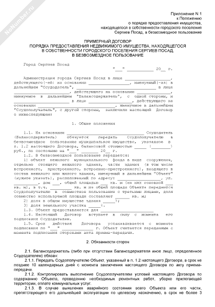 - 2317Примерный договор порядка предоставления недвижимого имущества, находящегося в собственности городского поселения Сергиев Посад Московской области, в безвозмездное пользование