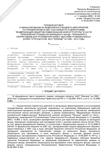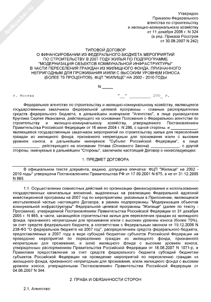 - 2507Типовой договор о финансировании из федерального бюджета мероприятий по строительству в 2007 году жилья по подпрограмме «Модернизация объектов коммунальной инфраструктуры» в части переселения граждан из жилищного фонда, признанного непригодным для проживания и/или с высоким уровнем износа (более 70 процентов), ФЦП «Жилище» на 2002–2010 годы