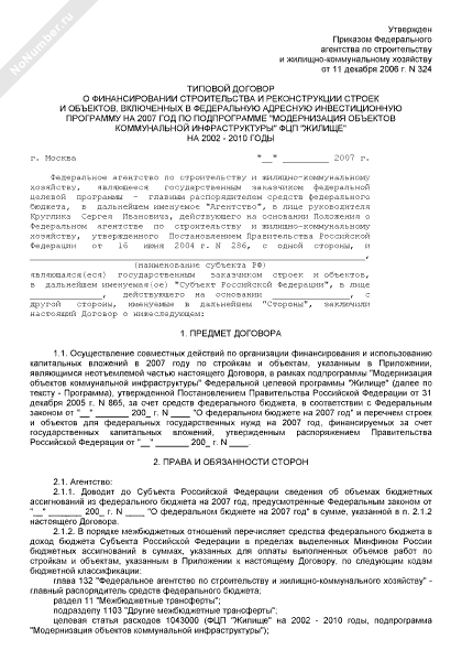 - 2504Типовой договор о финансировании строительства и реконструкции строек и объектов, включенных в Федеральную адресную инвестиционную программу на 2007 год по подпрограмме «Модернизация объектов коммунальной инфраструктуры» ФЦП «Жилище» на 2002–2010 годы