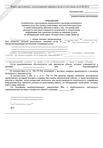 - 2543Требование заказчика о расторжении заключенного договора бытового подряда без оплаты выполненной работы, а также возмещении убытков в связи с тем, что вследствие неполноты или недостоверности полученной от подрядчика информации был заключен договор на выполнение работы, не обладающей свойствами, которые имел в виду заказчик