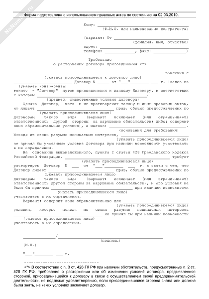 - 2545Требование присоединившейся стороны о расторжении договора присоединения в связи с тем, что договор лишает эту сторону прав, обычно предоставляемых по договорам такого вида, исключает или ограничивает ответственность другой стороны за нарушение обязательств либо содержит другие явно обременительные для присоединившейся стороны условия, которые она не приняла бы при наличии у нее возможности участвовать в определении условий договора