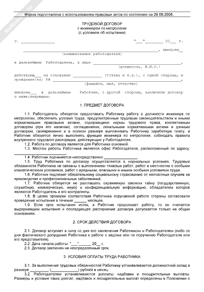- 2550Трудовой договор с инженером по метрологии (с условием об испытательном сроке)
