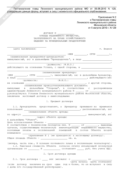 - 259Договор аренды недвижимого имущества, закрепленного на праве хозяйственного ведения за муниципальным предприятием Ленинского муниципального района Московской области