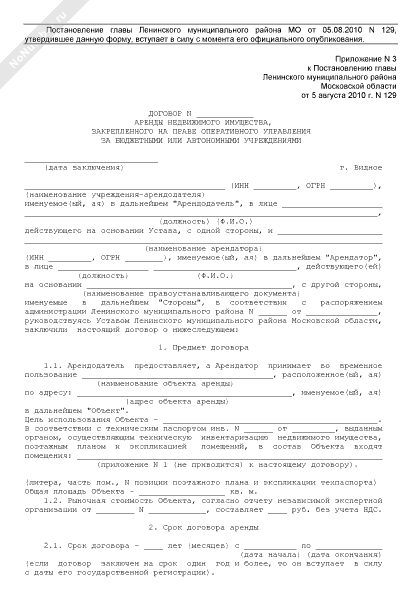 - 260Договор аренды недвижимого имущества, закрепленного на праве оперативного управления за бюджетными или автономными учреждениями Ленинского муниципального района Московской области