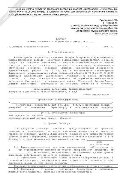 - 278Договор аренды движимого муниципального имущества городского поселения Дмитров Дмитровского муниципального района Московской области