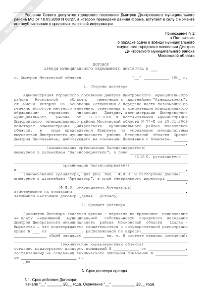 - 277Договор аренды муниципального недвижимого имущества городского поселения Дмитров Дмитровского муниципального района Московской области