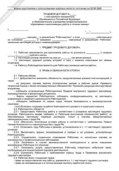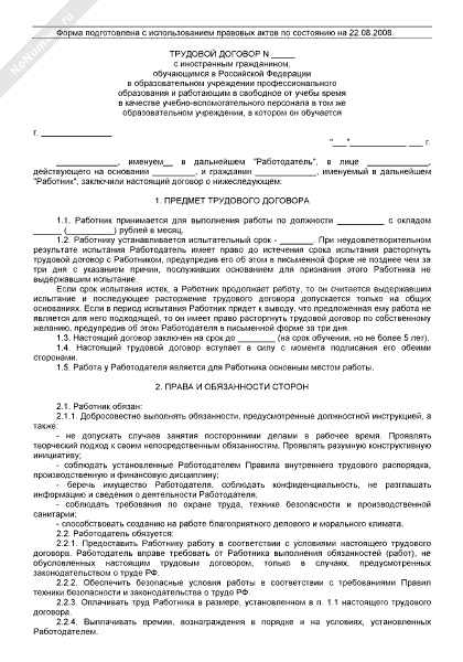 - 2936Трудовой договор с иностранным гражданином, обучающимся в Российской Федерации в образовательном учреждении профессионального образования и работающим в свободное от учебы время в качестве учебно-вспомогательного персонала в том же образовательном учреждении, в котором он обучается