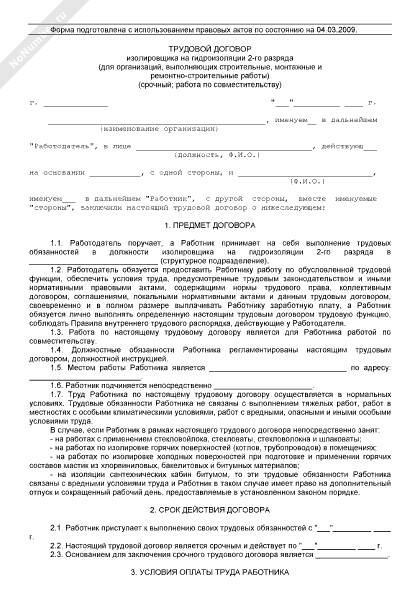 - 3044Трудовой договор изолировщика на гидроизоляции 2-го разряда (для организаций, выполняющих строительные, монтажные и ремонтно-строительные работы) (срочный; работа по совместительству)