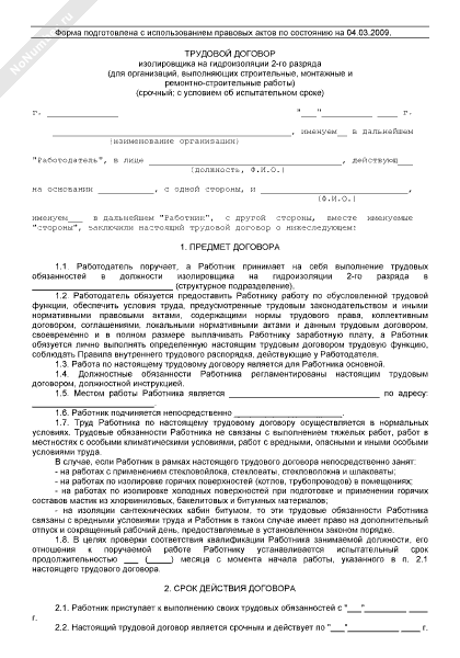 - 3045Трудовой договор изолировщика на гидроизоляции 2-го разряда (для организаций, выполняющих строительные, монтажные и ремонтно-строительные работы) (срочный; с условием об испытательном сроке)