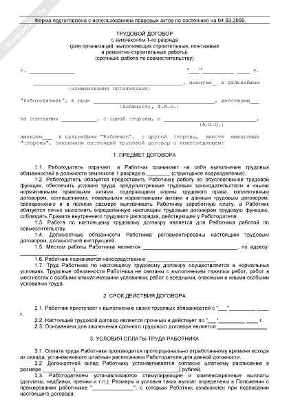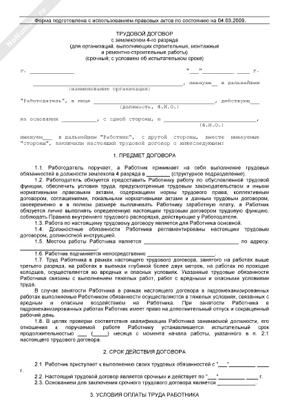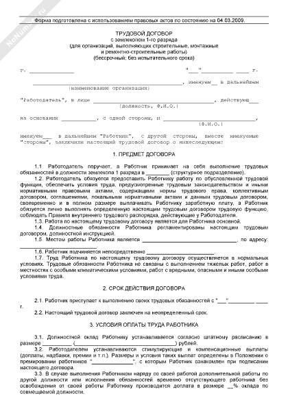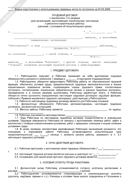 - 3060Трудовой договор с землекопом 1-го разряда (для организаций, выполняющих строительные, монтажные и ремонтно-строительные работы) (срочный; с условием об испытательном сроке)