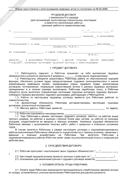 - 3055Трудовой договор с землекопом 5-го разряда (для организаций, выполняющих строительные, монтажные и ремонтно-строительные работы) (срочный; работа по совместительству)