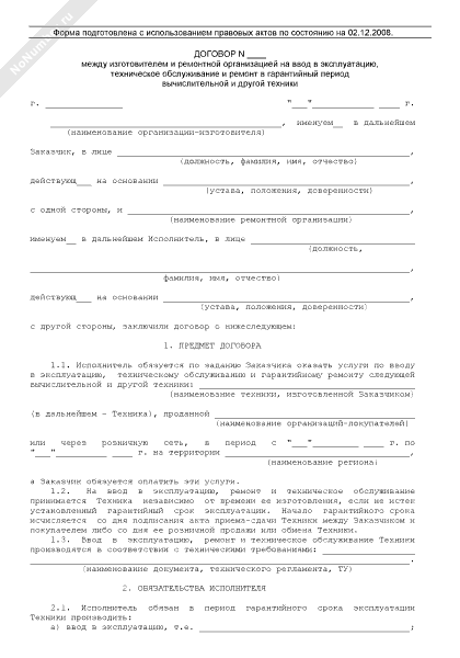 - 784Договор между изготовителем и ремонтной организацией на ввод в эксплуатацию, техническое обслуживание и ремонт в гарантийный период вычислительной и другой техники