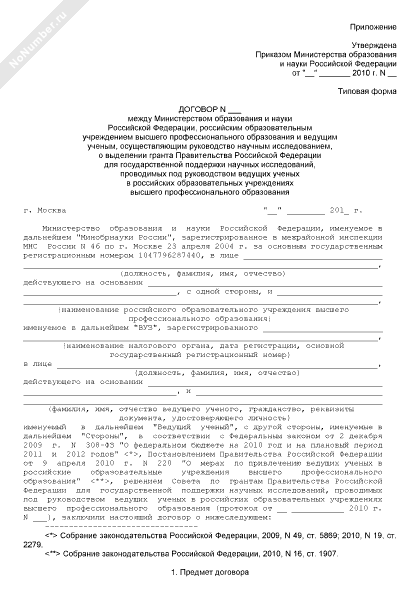 - 794Договор между Министерством образования и науки Российской Федерации, российским образовательным учреждением высшего профессионального образования и ведущим ученым, осуществляющим руководство научным исследованием, о выделении гранта Правительства Российской Федерации для государственной поддержки научных исследований, проводимых под руководством ведущих ученых в российских образовательных учреждениях высшего профессионального образования